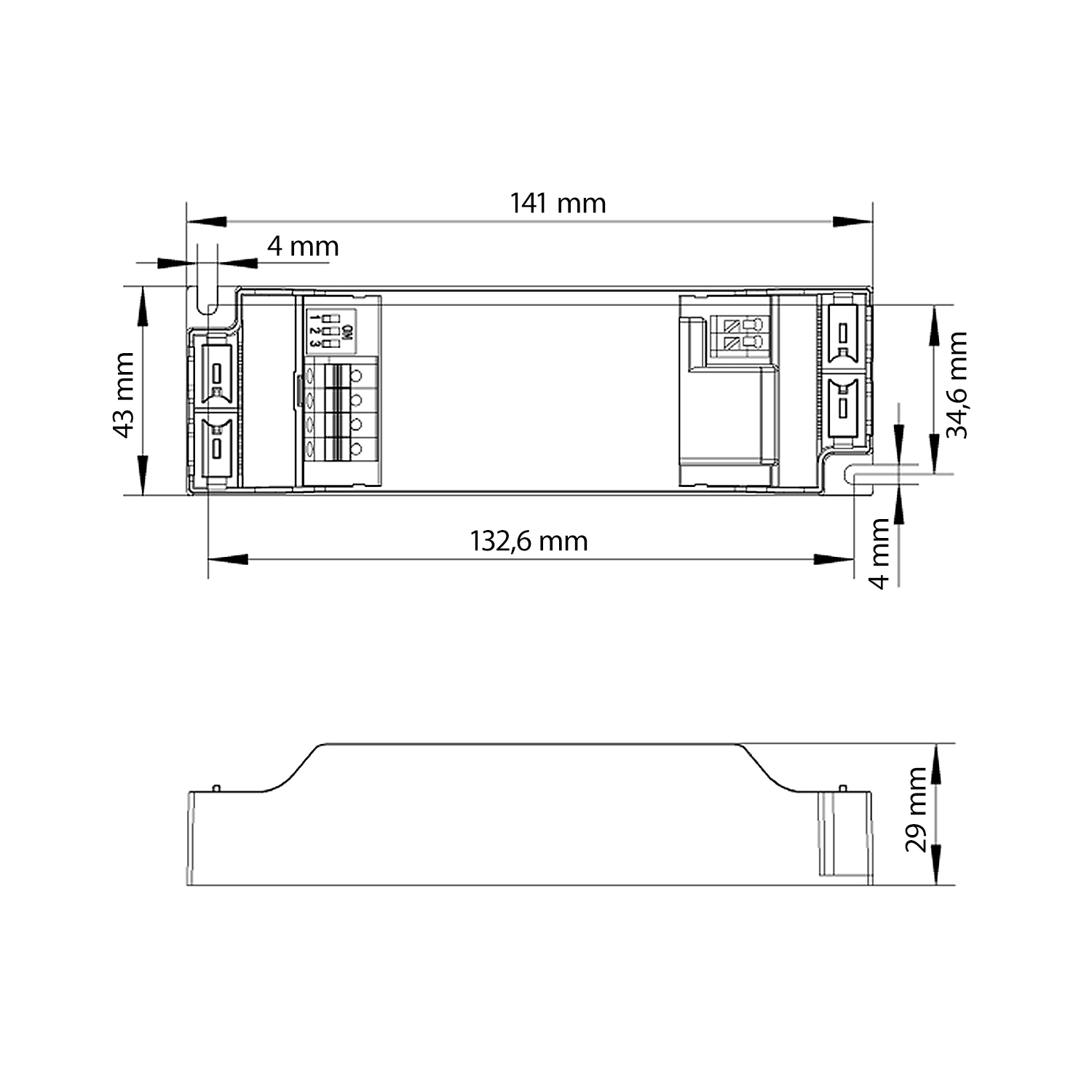 Abmessungen (L × B × H): 141 × 43 × 29 mm
